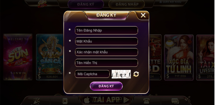 • Bước 2: Điền đầy đủ thông tin theo yêu cầu trong mẫu đăng ký thành viên, bao gồm tên đăng nhập, mật khẩu dễ nhớ, xác nhận mật khẩu, tên hiển thị khi chơi và nhập mã captcha theo hình.